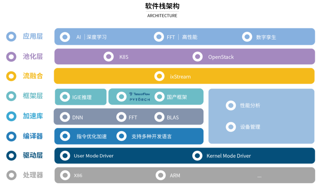 在软件生态方面,天数智芯围绕天垓与智铠系列硬件,打造了深度适配的完整软件栈解决方案。该软件栈涵盖编译器、驱动程序、优化性能函数库、开发者工具、AI框架、推理引擎及云原生支持组件,支持国内外主流的深度学习编程框架,并兼容主流异构计算开发框架。