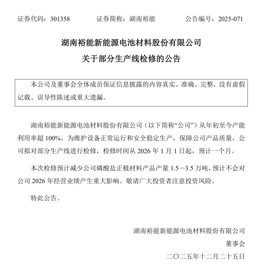 湖南裕能公告显示,2025年以来公司产能利用率持续超100%,为维护设备正常运行、保障产品质量,计划自2026年1月1日起对部分生产线开展检修,预计减少磷酸盐正极材料产量1.5—3.5万吨。