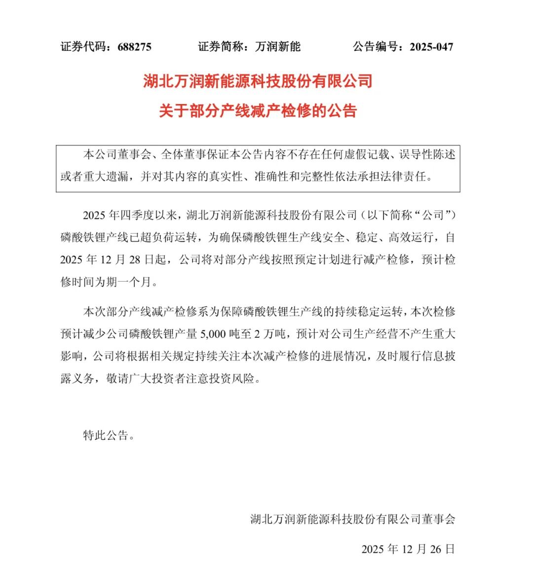 万润新能同步发布减产检修公告,因公司磷酸铁锂产线已超负荷运转,为确保生产线安全稳定高效运行,自2025年12月28日起对部分产线实施减产检修,预计检修时长一个月,本次检修预计减少磷酸铁锂产量5000吨至2万吨。