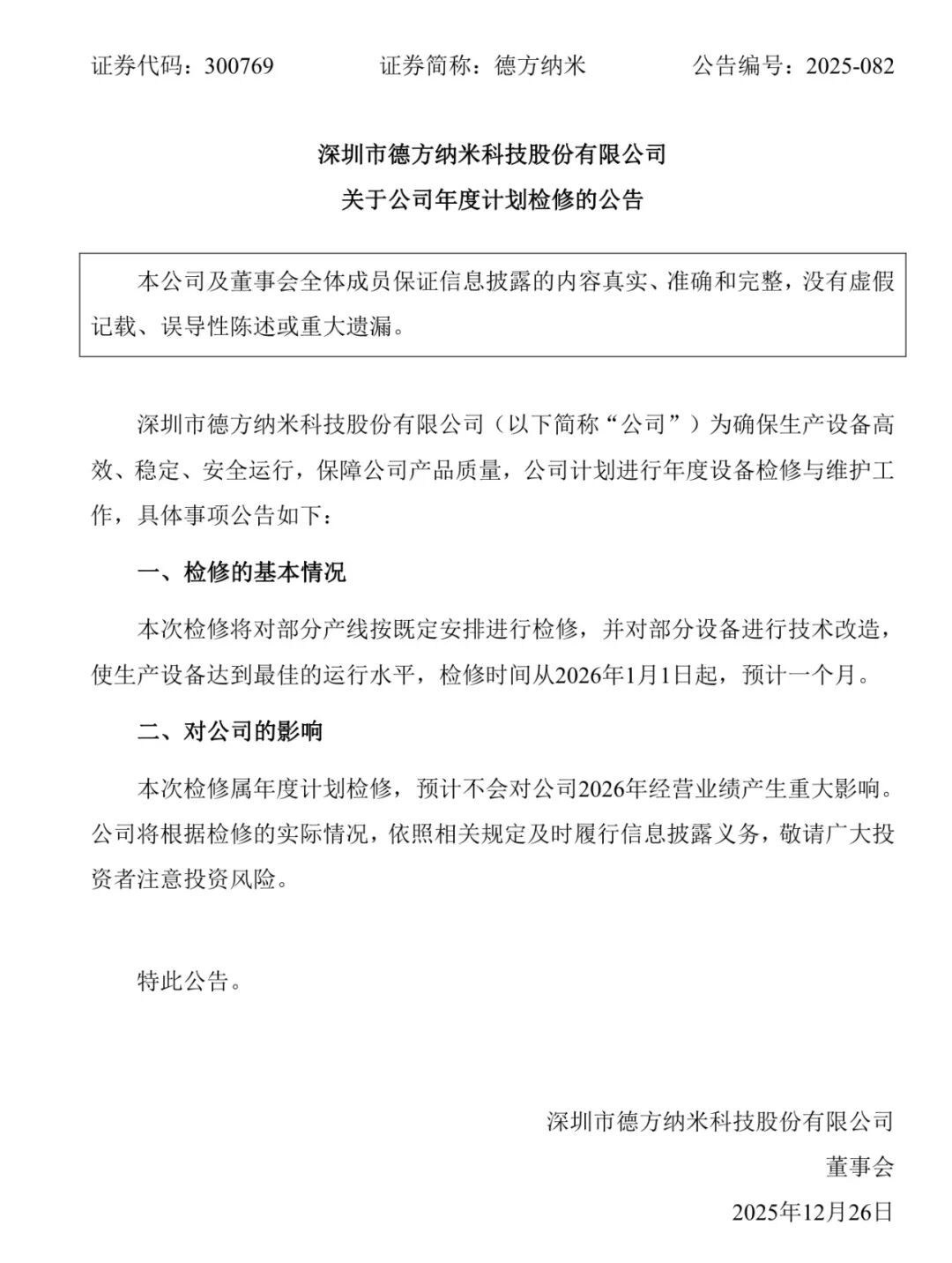 德方纳米的公告则称,为确保生产设备高效、稳定、安全运行,保障产品质量,公司将开展年度设备检修与维护工作,期间按既定安排对部分产线检修,同时对部分设备进行技术改造,以实现生产设备最佳运行水平,检修自2026年1月1日起,预计持续一个月,本次检修属年度计划内工作,预计不会对公司2026年经营业绩构成重大影响。