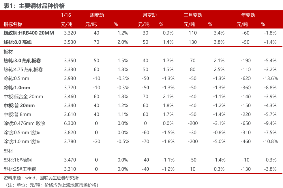 ◾ 价格:本周钢材价格上涨。截至1月16日,上海20mm HRB400材质螺纹价格为3320元/吨,较上周升40元/吨。高线8.0mm价格为3530元/吨,较上周升70元/吨。热轧3.0mm价格为3350元/吨,较上周升50元/吨。冷轧1.0mm价格为3720元/吨,较上周降10元/吨。普中板20mm价格为3340元/吨,较上周升40元/吨。本周原材料中,国产矿市场价格稳中有升,进口矿市场价格稳中有跌,废钢价格持平。
