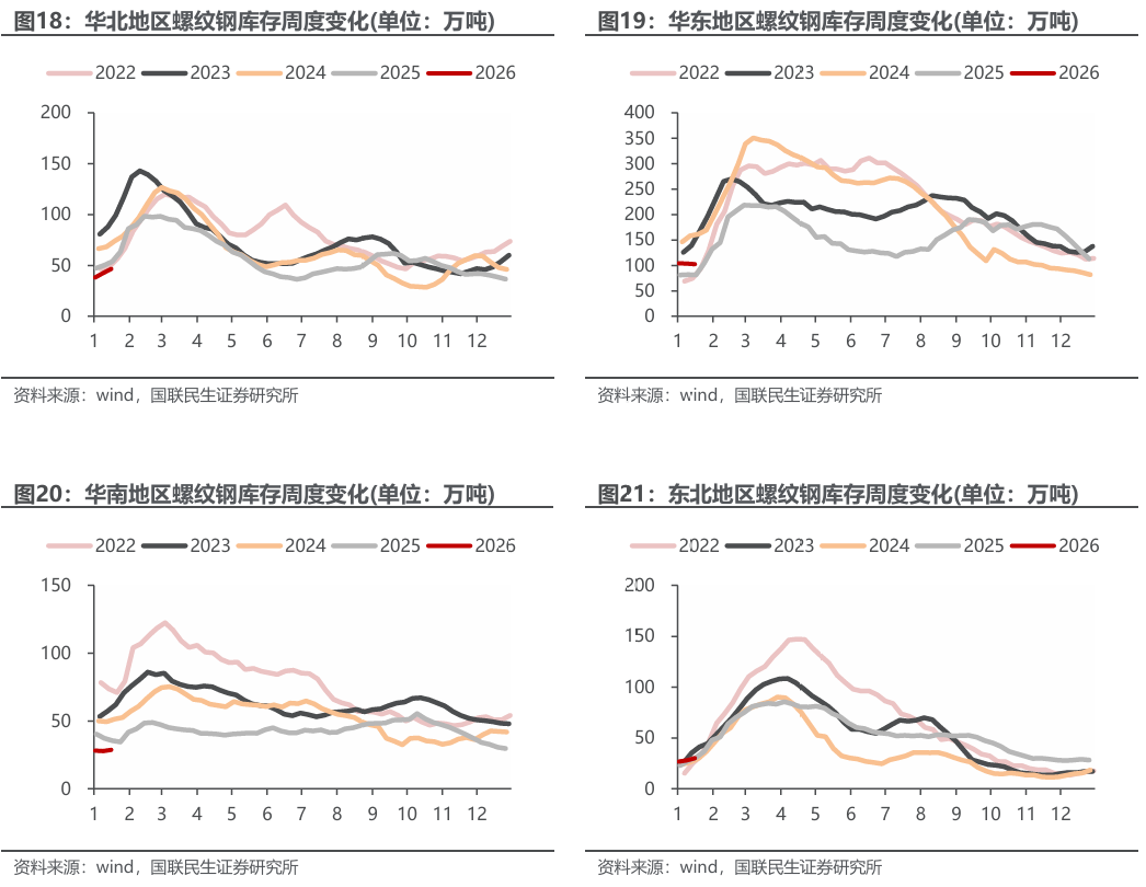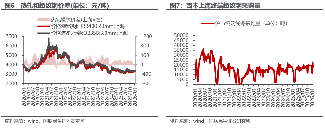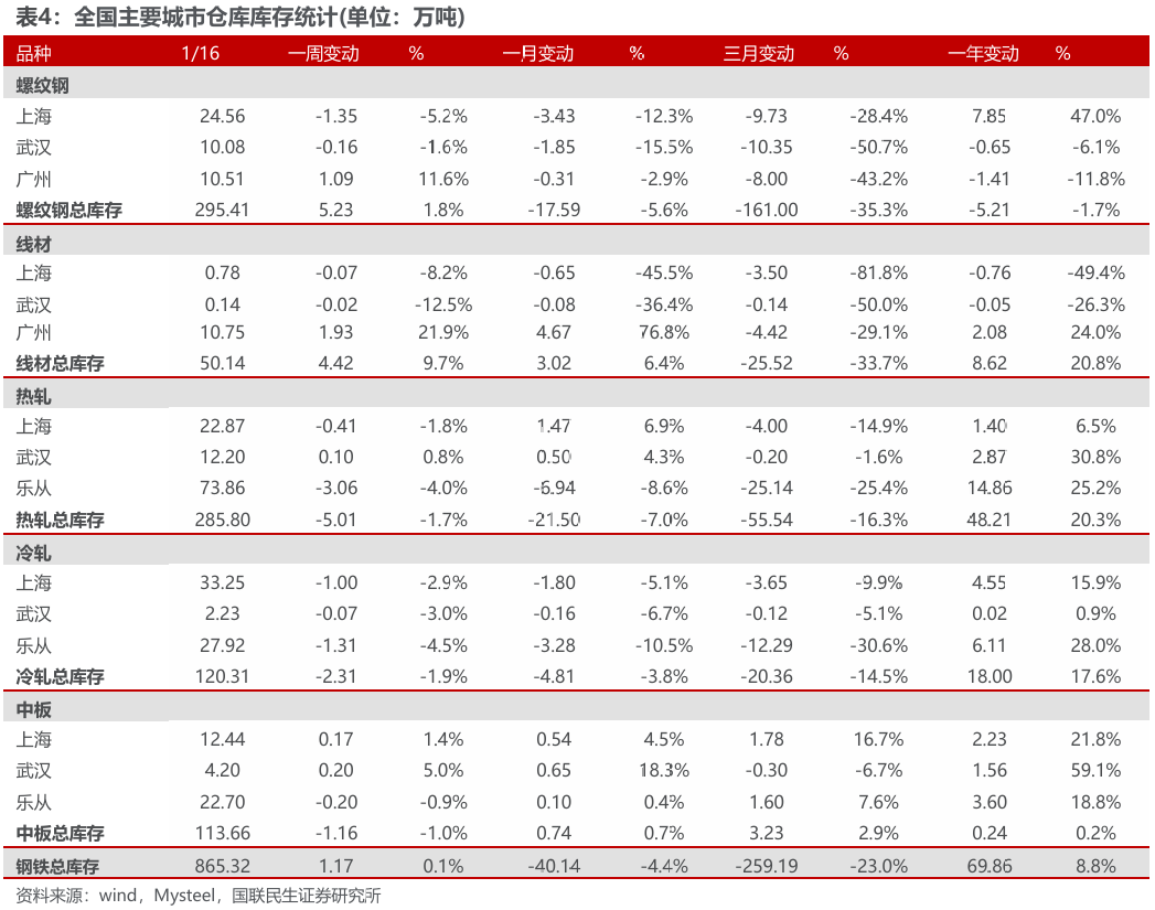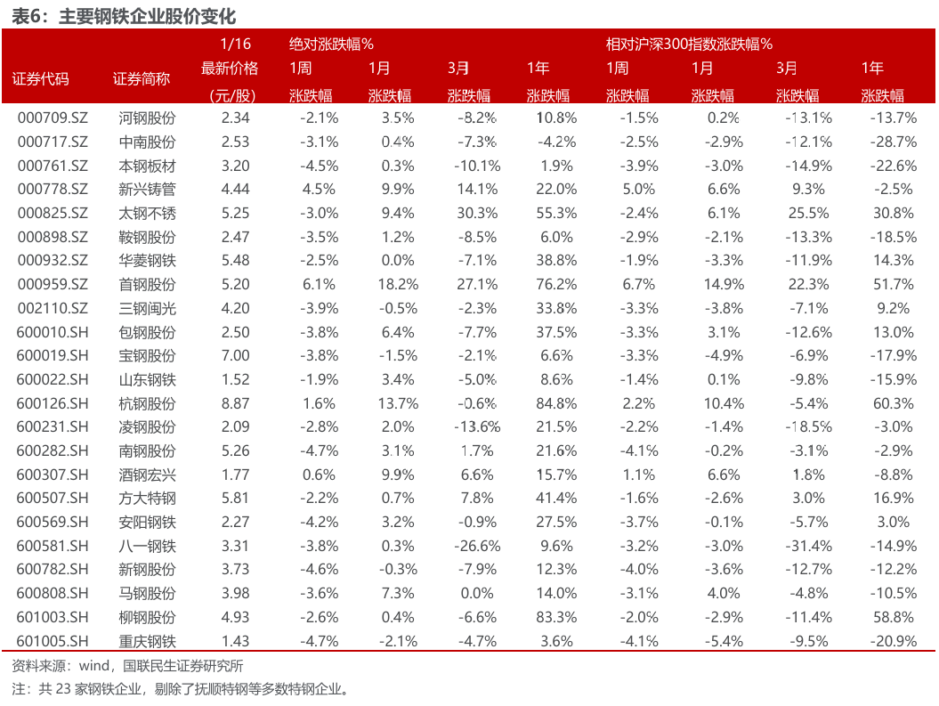 ◾ 产量与库存:截至1月16日,五大钢材产量上升,总库存环比下降。产量方面,本周五大钢材品种产量819万吨,环比升0.62万吨,其中建筑钢材产量周环比减0.16万吨,板材产量周环比升0.78万吨,螺纹钢本周减产0.74万吨至190.3万吨。分不同炼钢方式来看,本周长、短流程螺纹钢产量分别为156.34万吨、33.96万吨,环比分别-1.94万吨、 1.2万吨。库存方面,本周五大钢材品种社会总库存环比增1.17万吨至865.32万吨,钢厂总库存380.68万吨,环比降8.07万吨,其中,螺纹钢社库增5.23万吨,厂库降5.27万吨。表观消费量方面,测算本周螺纹钢表观消费量190.34万吨,环比升15.38万吨,本周建筑钢材成交日均值9.19万吨,环比下降4.68%。