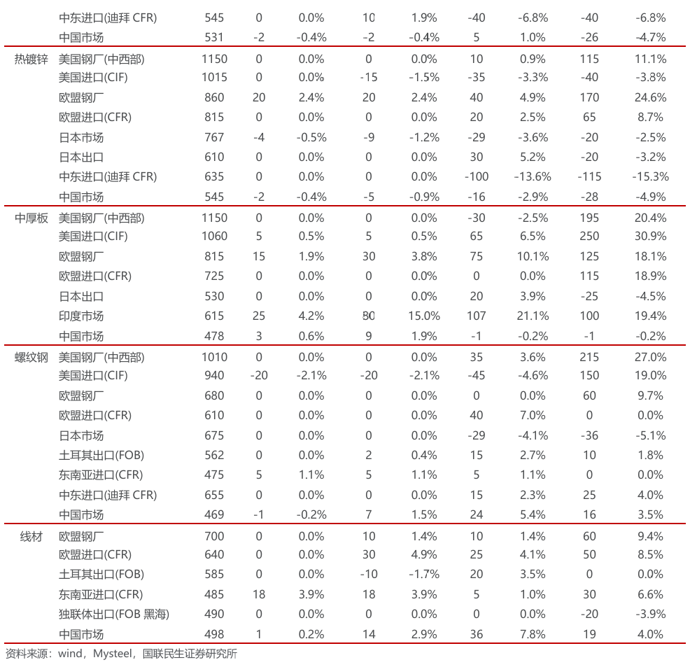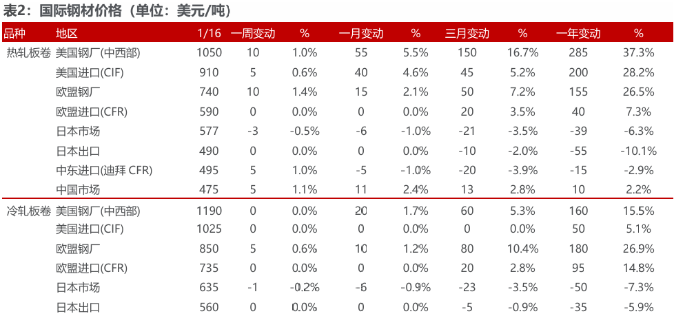 美国钢材市场价格稳中有升。截至1月16日,中西部钢厂的热卷出厂价为1050美元/吨,较上周升10美元/吨;冷卷出厂价为1190美元/吨,较上周持平。热镀锌价格为1150美元/吨,较上周持平。中厚板价格为1150美元/吨,较上周持平。长材方面,螺纹钢出厂价为1010美元/吨,较上周持平。