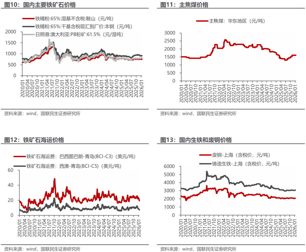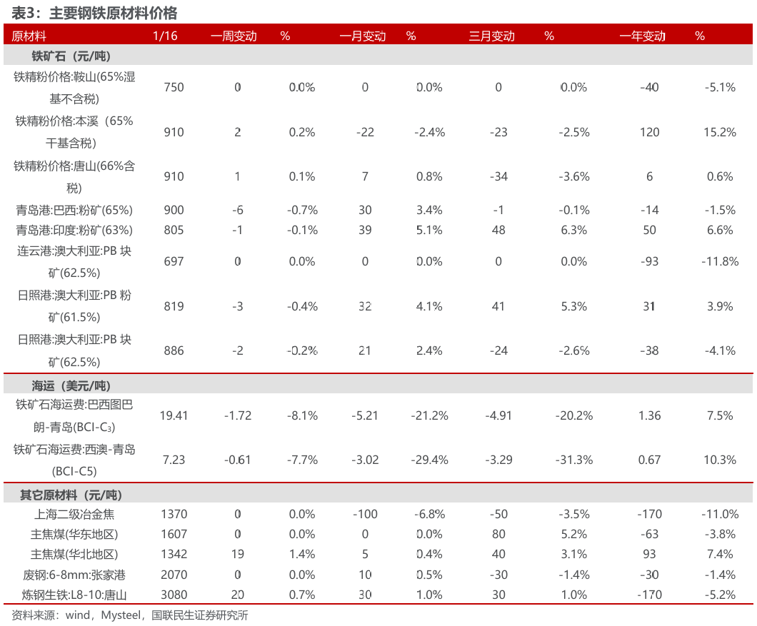国产矿市场价格稳中有升,进口矿市场价格稳中有跌,废钢价格持平。截至1月16日,本周鞍山铁精粉价格750元/吨,较上周持平;本溪铁精粉价格910元/吨,较上周升2元/吨;唐山铁精粉价格910.26元/吨,较上周升1元/吨;国产矿市场价格稳中有升。本周青岛港巴西粉矿900元/吨,较上周降6元/吨;青岛港印度粉矿805元/吨,较上周降1元/吨;连云港澳大利亚块矿697元/吨,较上周持平;日照港澳大利亚粉矿819元/吨,较上周降3元/吨;日照港澳大利亚块矿886元/吨,较上周降2元/吨;进口矿市场价格稳中有跌。本周海运市场下跌。本周末废钢报价2070元/吨,较上周持平;铸造生铁3080元/吨,较上周升20元/吨。