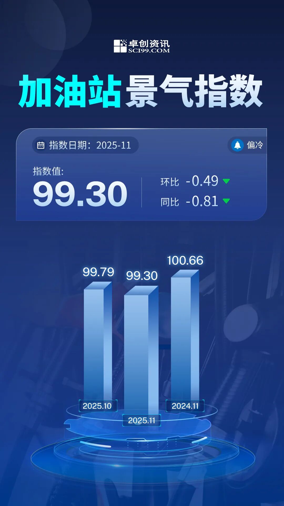 2025年11月,中国加油站景气指数录的99.30,较上月降低0.49个百分点,从景气区间来看,仍旧处于偏冷阶段。从分项指标来看,汽柴油供应指数、加油站利润指数、加油站存货周转指数及加油站竞争力指数均有所降低,共同导致11月加油站景气指数环比走低。
