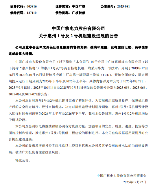 公告称,公司的子公司中广核惠州核电有限公司(简称“惠州核电”)的惠州1号及2号两台核电机组,均采用华龙一号技术,分别于2019年12月26日及2020年10月15日进行核反应堆主厂房第一罐混凝土浇筑(FCD),开始全面建设,原定预期投入运行日期分别为2025年下半年及2026年上半年。