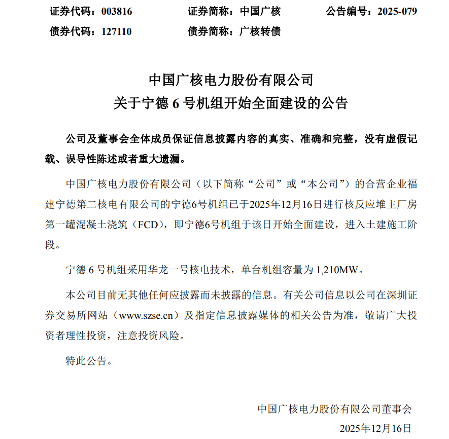 12月16日,中国广核公告称,公司的合营企业福建宁德第二核电有限公司的宁德6号机组已于2025年12月16日进行核反应堆主厂房第一罐混凝土浇筑(FCD),即宁德6号机组于该日开始全面建设,进入土建施工阶段。