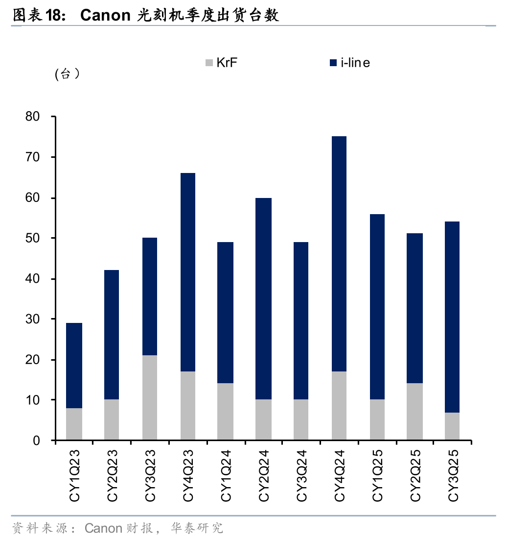 佳能产业设备部门(Industrial Group)围绕“泛半导体制造”构建了三大产品线:半导体制造设备(主攻成熟制程光刻机及最新的纳米压印NIL系统)、显示面板制造设备(包含大尺寸FPD曝光机及OLED制造系统),以及核心组件与检测设备(包含高精度传感器及测量仪器)。该部门2025年第三季度光学设备收入同比增长20.4%(其中,Krf光刻机出货7台,i-line光刻机出货同比增长8台达到47台),部门营业利润率为16.3%。