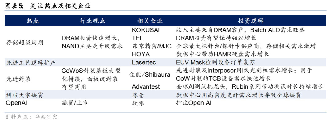 4)AI基础设施建设加剧部分科技产品供应紧张。光纤方面,由于贸易限制因素,日本主要厂商有望获得较多北美市场订单;存储方面,硬盘和NAND组装环节产能扩张节奏较为谨慎,Hoya等厂商或将主要通过提升存储密度应对需求增长。