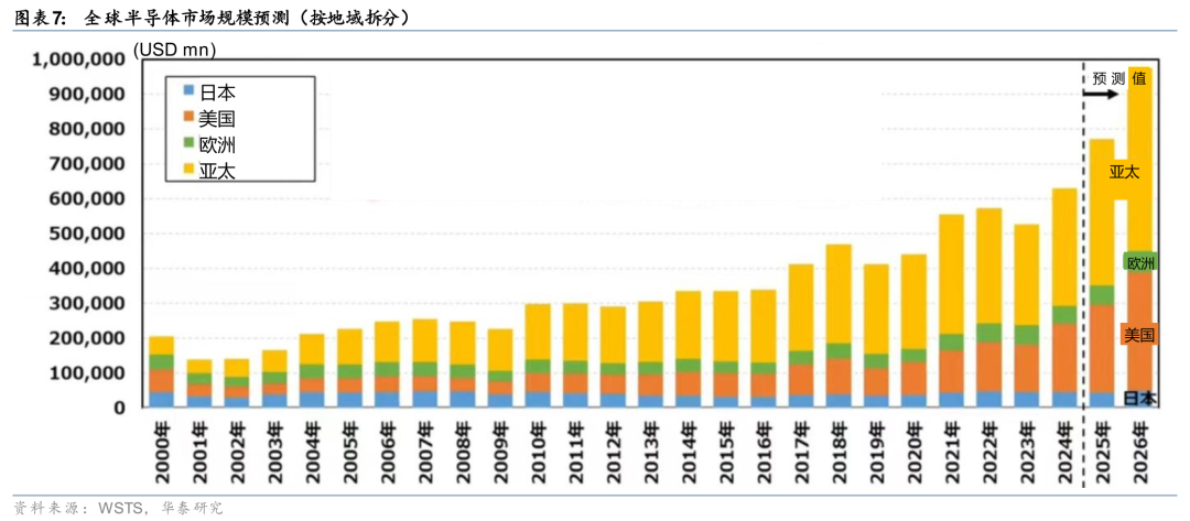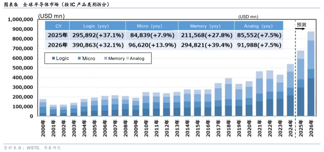 根据WSTS预测,全球半导体市场整体规模2025年预计同比增长22.5%;2026年预计同比增长26.3%,有望连续两年保持20%以上的高增速,市场规模或将进一步扩大至接近1万亿美元。分应用来看,存储市场规模2025/2026年同比增速有望达27.8%/39.4%;逻辑芯片市场规模2025/2026年预计同比增长37.1%/32.1%。