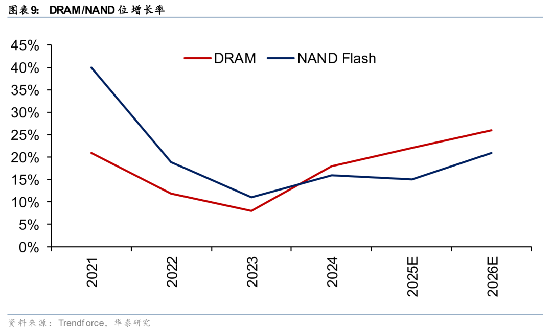 根据TrendForce数据,存储行业正迎来AI驱动的超级周期:1)需求端,DRAM增长主要由服务器市场驱动,特别是北美云服务商订单有望稳定增长。Trendforce预测2025/2026年DRAM位增长率或将达到22%/26%;NAND Flash方面,AI应用有望继续推动企业级SSD强劲需求,2025/2026年位增长率预计达到15%/21%,但AI应用对PC和智能手机中NAND Flash的影响或仍然有限;2)供给端,三大DRAM厂商在AI和HBM驱动下积极推进制程迁移,2026年capex预计续增23%,其中Micron同比增速较快,达40%,SK Hynix/ Samsung同比或将增长25%/17%。我们看好本轮存储超级周期的持续性。