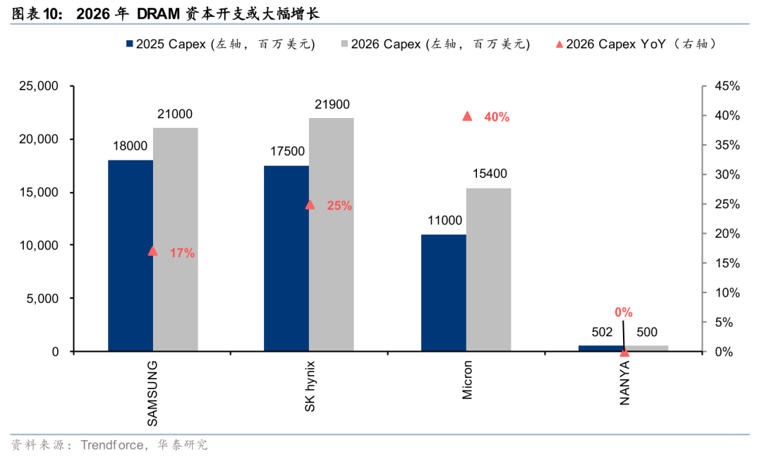 需求侧,根据TrendForce数据,2026年DRAM位增长率或达26%,NAND 位增长率或达21%,较2025年(22%/15%)呈现加速态势,主要受AI服务器、HBM渗透率提升及数据中心扩建等因素驱动。供给侧,TrendForce预计2026年DRAM资本开支同比或增长23%,显著高于历史平均水平,反映存储厂商在技术升级(HBM、DDR5)和产能扩张方面的积极布局,存储“超级周期”下的供需共振格局进一步确立。