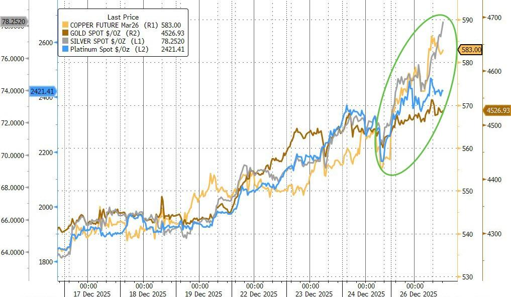 周五黄金、白银和铂金均创历史新高, 沪铜史上首次突破10万元人民币关口, 纽铜超越了今年7月史无前例的逼空行情期间所创盘中最高纪录。