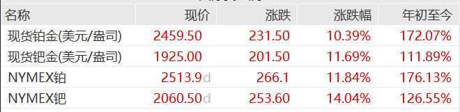 铂族金属同样表现惊人。现货铂金大涨10%至每盎司2459.5美元,创历史新高,全年涨幅超170%,是自1990年有伦敦基准价以来最大年度涨幅;钯金也涨逾11%至每盎司1925美元,全年涨幅已超111%。