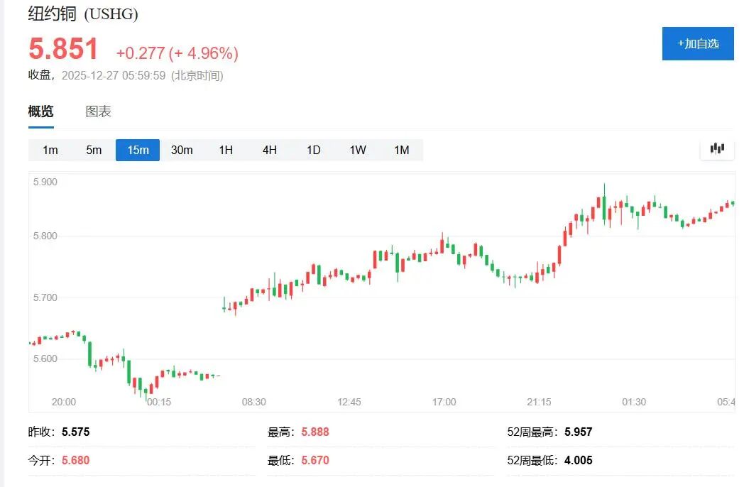 周五纽铜涨势更猛。到周五尾盘,纽约期铜主力合约COMEX 3月期铜处于5.8510美元/磅上方,较前一交易日收盘涨近5%,美股盘中曾涨至5.8880美元,超越了今年7月史无前例的逼空行情期间所创盘中最高纪录,日内涨5.6%。