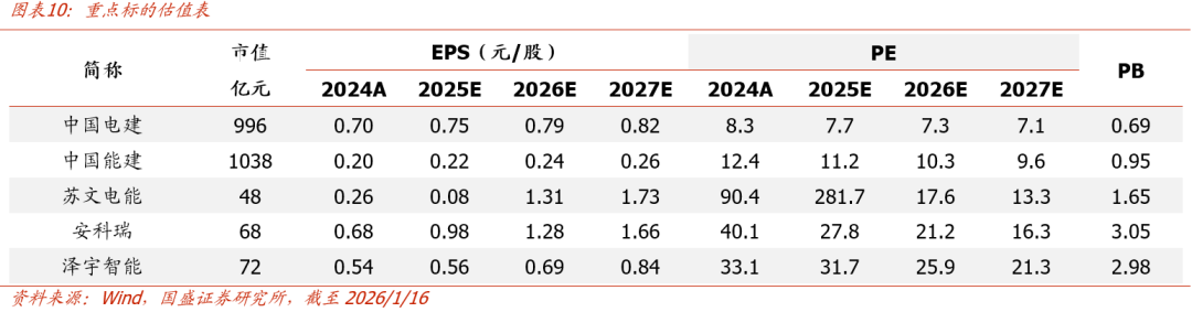 国网规划“十五五”固投增长40%,2026年或为电网投资“大年”。2026年我国有望开启电网投资新一轮景气周期:1)从内因驱动看,预计“十五五”期间风光新能源装机年均新增量大(国家电网计划支撑服务经营区年新增约2亿千瓦),新能源高比例接入对主网外送、配网承载、灵活调节与数字化调度提出系统性增量需求。根据国网规划,“十五五”跨区跨省输电能力较“十四五”末提升超过30%、加快特高压外送通道与城市/农村/边远地区配网建设,同时夯实数智基础设施并推进“人工智能 ”专项行动,有望推动特高压直流通道(解决西电东送、北电南供)、配电网扩容(解决分布式接入)以及新型储能并网建设提速。2)从外部市场看,北美及欧洲电网设备老化严重,叠加AI算力中心爆发带来的电力缺口,导致海外电网改造工程需求旺盛,同时相关设备供应紧张(交付周期延长至2-3年)。中国电力工程服务企业凭借技术、施工效率及采购成本优势,正在加速出海,电网相关工程服务与设备出口有望迎量价齐升。3)从资金及规划看,根据国家电网披露,“十五五”期间计划固定资产投资高达4万亿元,相较于“十四五”期间投资额大幅增长约40%(“十四五”期间约2.85万亿元),意味着未来五年年均投资额将从“十四五”的5000多亿提升至8000亿元新台阶。4)从“稳增长”投资需求看,当前经济复苏动力偏弱,政策有望继续加码“稳增长”,推动投资止跌回稳。电网等重大基础设施是经济社会运行的底座,是国民经济“稳定器”和“压舱石”,也是目前基建中具备较强经济效益的细分领域。其投资主体为国网和南网两大中央企业,将是未来中央“加杠杆”的主要方向之一。预计“十五五”期间电网建设将保持高强度,迎来新一轮景气周期。我国电网投资景气趋势明确,建筑板块可重点关注以下受益标的:中国电建:能源全产业链服务龙头,电网建设领军者。公司业务涵盖新老能源几乎全部领域,具备从规划设计、施工建设到投资运营的全产业链一体化服务能力。其前身组成中包括国家电网和中国南方电网14个省(区域)电网企业所属的勘测设计企业、电力施工企业、装备修造企业,因此在电网建设领域具备很强竞争优势,深度参与了多项国家特高压大型项目,如白鹤滩—江苏±800千伏特高压等国家“西电东送”核心枢纽工程,覆盖直流输电、交流输电、换流站建设及新能源外送工程等多个关键领域,有望受益后续特高压建设提速。中国能建:特高压设计领域市占率第一。公司以能建集团电规总院为依托,在我国能源整体规划中占据核心地位,是新老能源一体化综合服务龙头,在特高压设计领域市占率第一。公司完成了国内90%的特高压输电线路勘测项目(2024年),具备绝对市场份额和领先技术实力。根据国网规划,“十五五”期间跨省跨区输电能力要求提升30%,特高压工程预计将密集落地,中国能建有望率先受益于勘测设计环节启动,并在后续工程建设中持续获得大量订单。苏文电能:稀缺的配网EPCOS一站式服务商。公司主营配电网的E(咨询设计)、P(智能制造)、C(安装集成)、O(投资运营)和S(软件信息),服务工厂企业、产业园区、公共事业、商办中心、住宅小区、集团企业、智能电网七大用户场景,是稀缺的一体化服务商。2024年我国配电网投资3216亿元,同增10%,占电网投资的55%。国网“十五五”明确提出加快配电网及微电网建设,随着分布式新能源、储能、充电桩等设施大量接入配网,配网重要性持续提升,投资规模有望持续加大,对专业化配电网EPCOS服务的需求有望加速释放,公司作为细分领域龙头,有望核心受益。安科瑞:微电网能效管理龙头。国网“十五五”规划强调要探索末端保供型、离网型微电网模式,夯实数智基础设施,实施“人工智能 ”专项行动,强化电网数字赋能,有望驱动企业微电网能效管理需求进一步增多。随着国家“双碳”和“双控”政策推进、分布式新能源装机量持续增多、峰谷电价差拉大、电价市场改革持续推进,企业微电网能效管理系统需求有望加速释放(我们测算我国企业微电网能效管理市场总需求2万亿,每年释放需求超500亿)。公司聚焦中低压企业微电网能效管理所需的设备和系统,提供包括研发、生产、销售、及运维的全流程服务,是国内企业微电网能效管理领军企业,并于近年来加速推动海外扩张,未来有望深度受益企业微电网能效管理系统需求快速增长。泽宇智能:电力信息系统集成龙头,受益电网数字化升级。国网“十五五”规划强调“夯实数智基础设施”,电网数字化需求有望进一步提升。公司核心主业为电力信息系统集成,服务于各级供电公司的信通、调度、设备、配网等部门及其所属的各业务单元。电力信息系统是电力不可或缺的重要组成部分,是电网自动化、智能化的基础。公司深耕电力信息化多年,技术、渠道、产品实力突出,同时在电力AI模型、虚拟电厂、气象监测装置、电力巡检机器人、电力通信运维数字化等领域持续积累研发成果,后续有望重点受益电网数字化升级。永福股份:智能电网技术领先,零碳电力科技翘楚。公司以电力设计业务切入电力行业,具备电力行业全产业链系列资质。当前公司主要提供电力能源解决方案(涵盖电网等方面)、数智能源产品(数智化监控系统、电力大数据平台、虚拟电厂平台),在智能电网、数智能源等领域技术实力