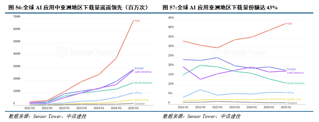 应用方面,最显著的趋势是,亚洲(主要由中国市场驱动)的份额从23H2的约32%稳步增长至超过40%,成为全球最大且增长最快的AI应用市场。相比之下,北美市场的份额则从约20%下降至约10%。与移动互联网类似,亚洲(尤其是中国)庞大且活跃的消费者群体为AI应用提供了最佳的“试验场”和变现渠道。