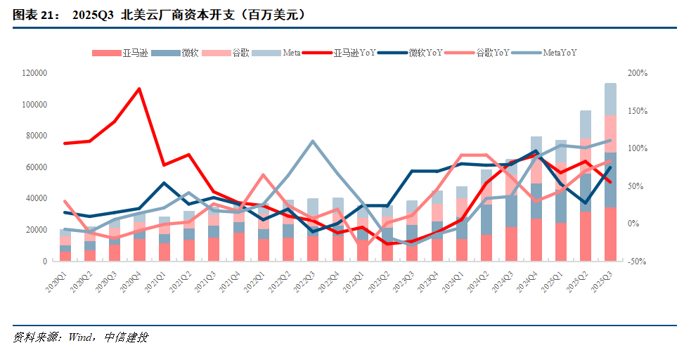 北美四家CSP厂商已经公布三季报,资本开支加速增长,同时各家对未来基础设施投资均继续保持积极态度。北美四大云厂商今年资本开支逐季提升:2025Q1资本开支总计773亿美元,同比增长62%;2025Q2资本开支总计958亿美元,同比增长64%;2025Q3资本开支总计1133亿美元,同比增长75%,环比增长18%。