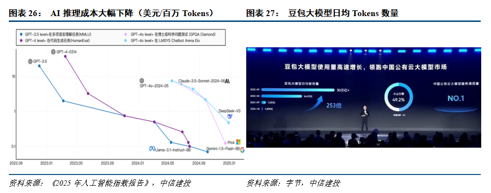 据国家数据局数据,2024年初中国日均Tokens的消耗量为1000亿,截至今年6月底,日均Token消耗量已突破30万亿,1年半的时间增长300多倍。以豆包为例,去年12月中旬,豆包日均Tokens使用量已超过4万亿,较七个月前首次发布时增长了33倍;截至2025年3月底,豆包大模型日均Tokens 调用量已超过12.7万亿,是2024年12月的3倍,是一年前刚发布时的106倍;截至2025年5月底,其日均Tokens使用量超过16.4万亿,同比增长137倍。2025年10月16日,火山引擎总裁谭待在武汉举行的FORCE LINK AI创新巡展上披露,豆包大模型的每日Token调用量从去年5月的1200亿增长至今年9月的30万亿,实现253倍增长。根据IDC报告,今年上半年火山引擎在中国公有云大模型服务调用量上居第一,市场份额达49.2%。