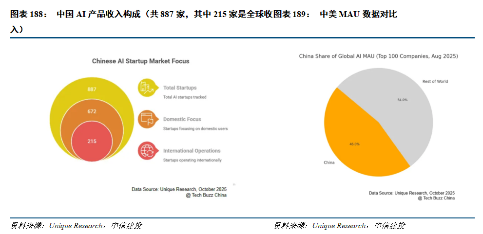根据Unique Research 2025年10月发布的C端AI产品数据显示,中国C端AI应用的MAU占到全球用户数的34%,但是C端商业化收入ARR仅为5亿美金,而美国AI应用ARR达到了334亿美金。这里面有几方面原因,一方面中国互联网大厂的AI产品很多是嵌入原有业务中,未单独披露ARR(例如谷歌也未统计进去)。另一方面,中国AI大模型主要为本地化部署,未形成像OpenAI这样的会员订购模式(Unique Research统计OpenAI的ARR为175亿美金,占了美国334亿中的超过一半)。但不可否认的是,美国AI应用的商业化正在蓬勃发展中,加上美国对于软件的付费意识较好,因此大量的AI应用开始实现规模化的收入,进而反哺其研发和推广。