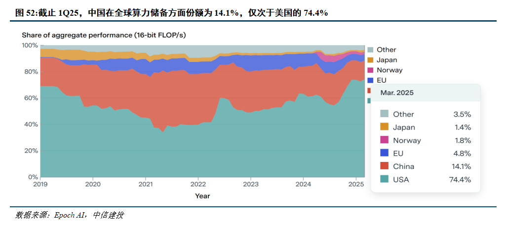 美国领先全球算力布局,中国受制于供给限制显著落后。根据Epoch AI,中美领先全球AI算力布局,其中美国以74.4%的16-bit FLOP/s份额占据绝对主导地位,而中国持有14.1%的份额,位居全球第二,但与美国存在显著差距,主要受制于芯片采购禁令以及上游制造代工设备采购限制,导致本土芯片产能也同样受限。