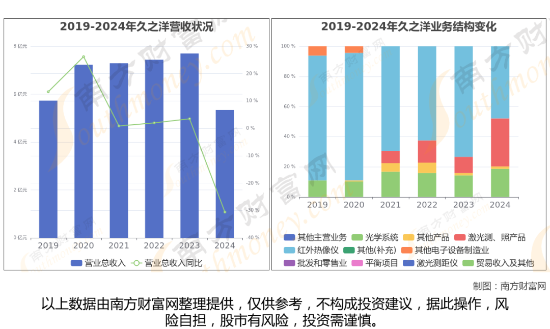 久之洋于2016年6月2日在深圳证券交易所上市,公司主营业务为红外热像仪、激光类、光学元件及膜系镀制、星体跟踪器的研发、生产与销售。