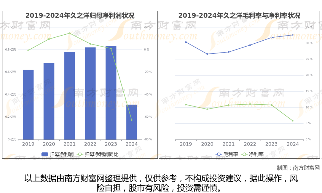 久之洋年报数据显示(如上图),2024年实现营业总收入5.34亿,同比增长-30.58%,近5年复合年增长率-7.27%。