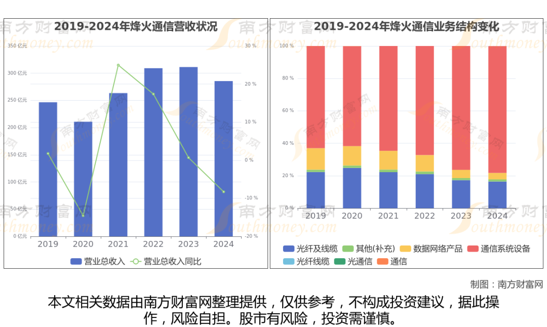 数据显示(如上图),烽火通信公司2024年营业收入285.49亿,同比增长-8.29%,近5年复合年增长率(CAGR)7.88%。