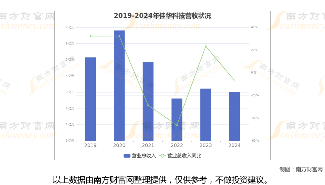佳华科技财务数据显示(如上图): 2024年实现营业总收入 3亿,同比增长-6.81%。近五年复合增长率(CAGR)为-18.51%。