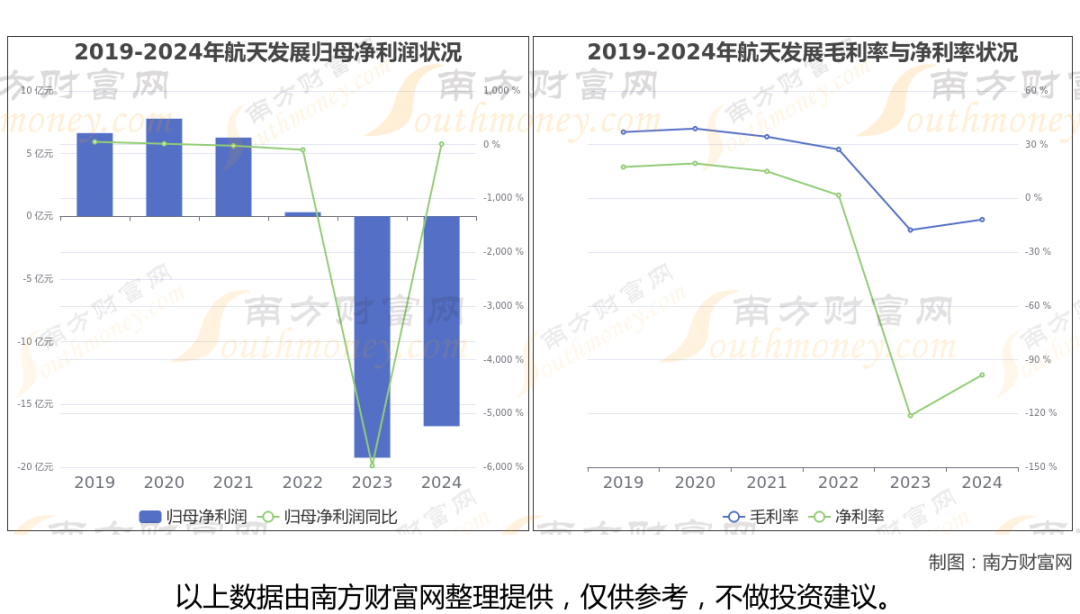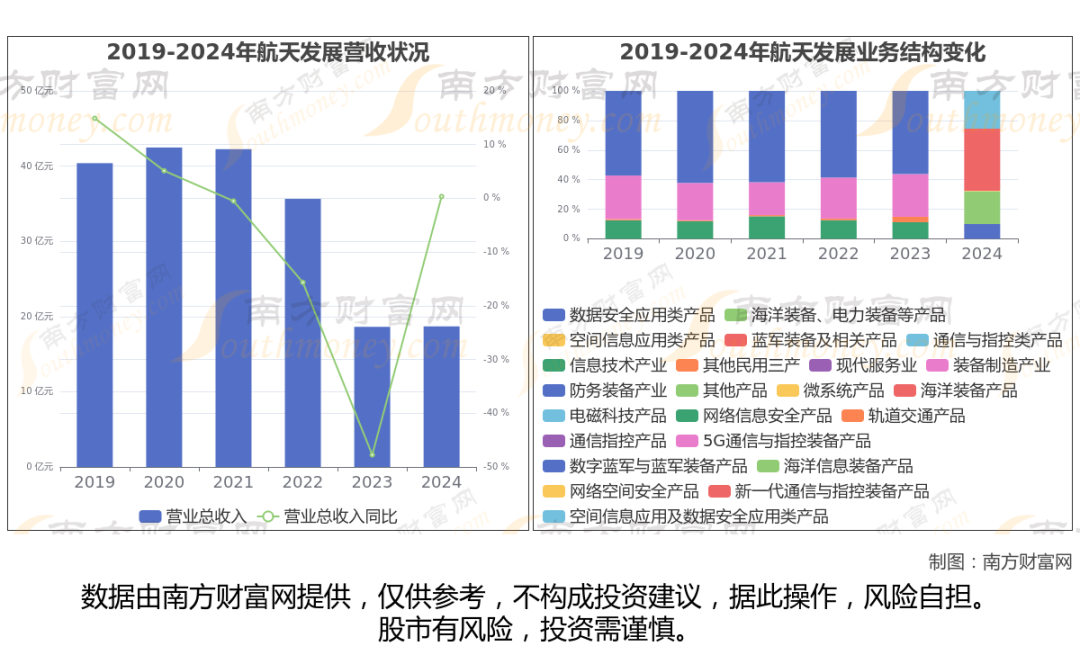 根据公司年度数据显示(如上图),2024年,航天发展实现营业总收入18.69亿,同比增长0.34%,近5年复合年增长率-18.55%。