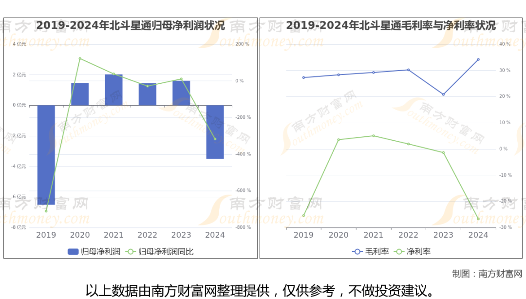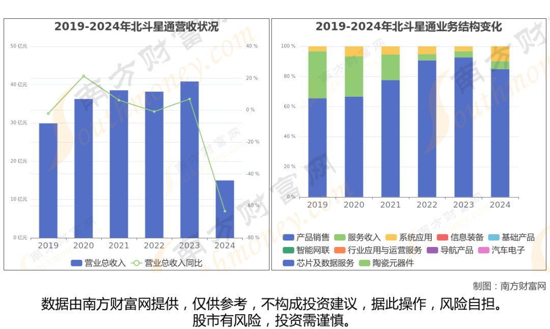 北斗星通年报数据显示(如上图),2024年实现营业总收入14.98亿,同比增长-63.3%,近5年复合年增长率-19.81%。