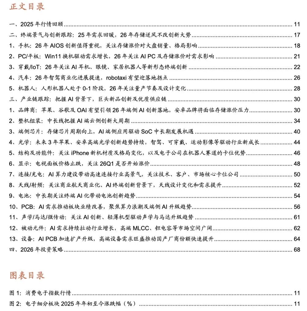 回顾25年,在终端需求回暖及端侧AI创新初步落地下,消费电子板块Q1-3向上增长,但是Q3末开始震荡下行,因担忧存储涨价对终端需求的抑制,最终年初至今上涨47.5%,略跑输电子指数0.6pct。展望26年,尽管受存储涨价影响,消费电子板块基本面预期处于低位,但是26-27年AI端侧加速创新趋势明确,Apple、谷歌、OAI等大厂抓紧布局AI终端入口,来实现算力-终端-应用的闭环,我们认为存储逆风不改AI端侧大势,把握AI背景下巨头新品创新及优质供应链,尤其是优质果链将是北美AI硬件龙头需要抢夺的重要产业链资源,以及AI PC、穿戴、IoT、机器人、智能车等链条;手机方面,存储涨价对中低端安卓机影响更大而苹果影响可控,今年豆包AI手机实现浅层Agent,更深度需是AIOS和App底层功能融合,明年H1苹果AIOS升级值得重视,安卓也会百花齐放;PC方面,Win11换机驱动需求增长,26年关注AI PC及存储涨价对需求影响;IoT方面,26年重点关注AI耳机、眼镜、家居等新形态终端创新;人形机器人方面,26年关注量产节奏及设计变化,电子公司卡位机器人赛道的优势不容忽视;智能车方面,政策催化、技术升级下,预计26年高阶智驾将正式迈入商业化应用新阶段。