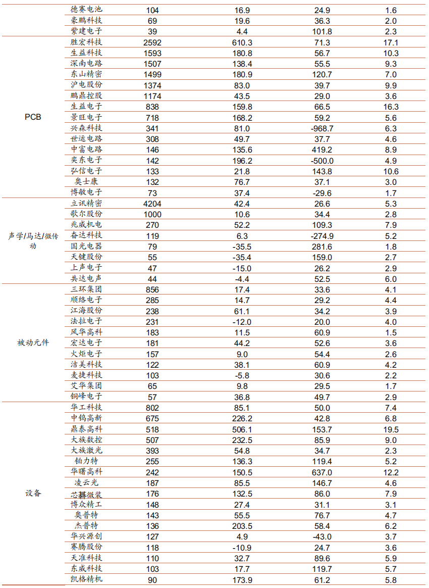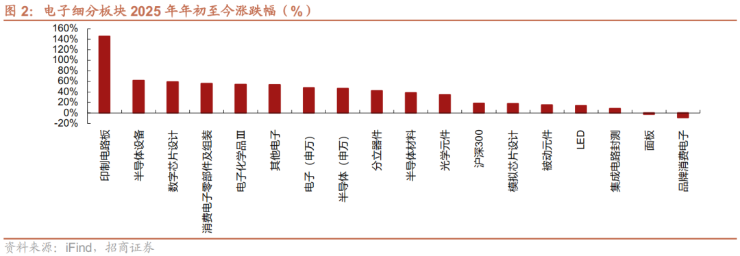 从细分板块来看,PCB 145.9%、消费电子零部件及组装 55.8%,跑赢电子行业指数,光学元件 34.9%、被动元件 15.5%、LED 13.8%、面板-2.3%、品牌消费电子-8.7%,跑输电子行业指数。PCB 板块位列首位主要是 AI 算力需求推动,而消费电子零部件及组装板块跑赢主要是部分跨 AI 算力、机器人等相关公司涨幅显著,而与 AI 算力关联度降低的光学元件、被动元件、LED、面板、品牌消费电子等跑输电子指数。