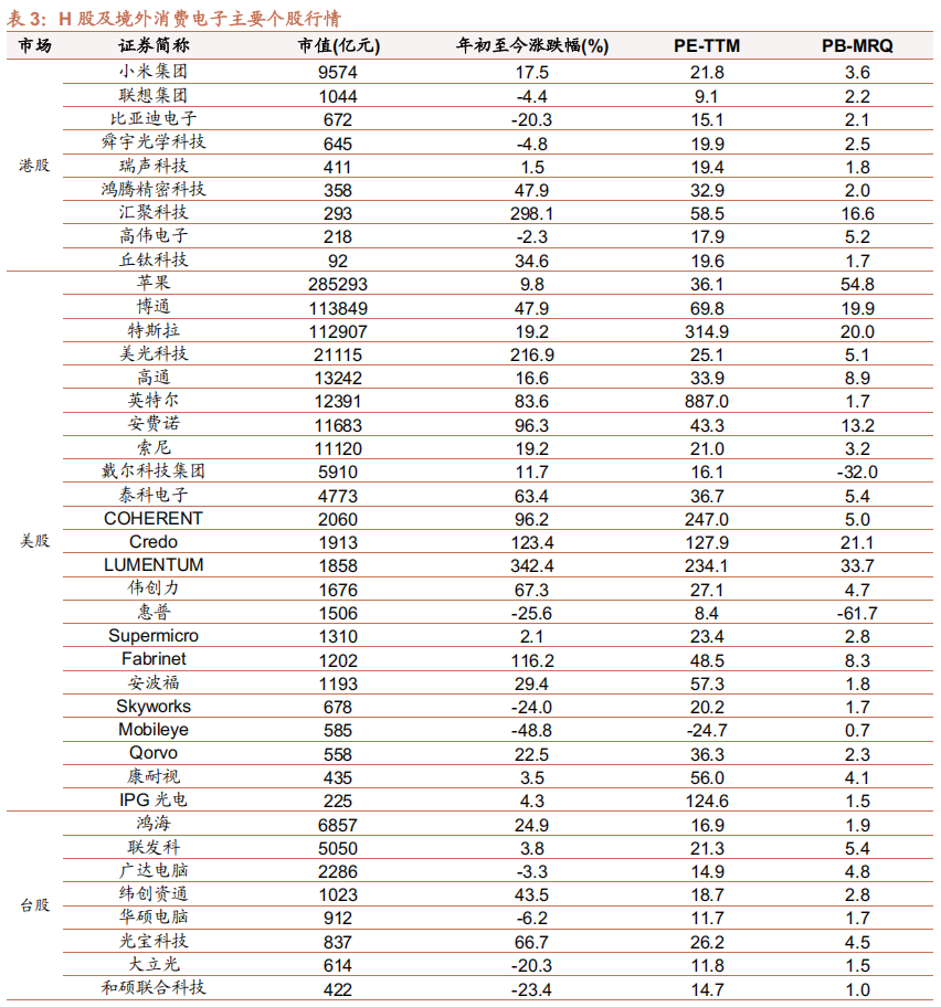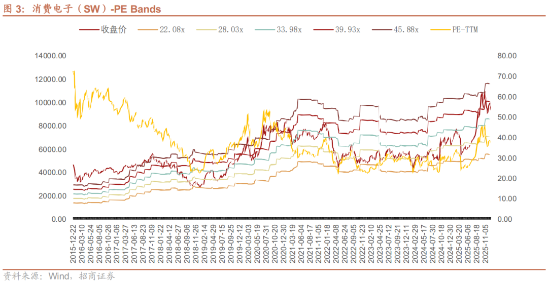2025年年初至今(截至12月26日),消费电子SW行业指数 47.5%,跑输电子SW行业指数0.6pct,跑赢沪深300指数29.1pcts,年初伴随DS-R1开源模型的横空出世,市场预期端侧AI有望加速落地,板块稳步向上;4月中美关税战使得北美市场敞口大的消费电子板块超跌;伴随关税压力边际缓解,5月开始板块迎来修复;进入7-8月,伴随秋季新品进入密集发布期,板块持续向上增长;9月,伴随iPhone销量超预期,OAI等端侧AI布局引发关注,再叠加消费电子公司在算力、机器人等领域的卡位优势逐渐被市场挖掘,板块进一步向上增长;但9月底开始至今,市场开始担忧存储等涨价对消费电子终端需求的抑制,板块表现出震荡下行趋势。