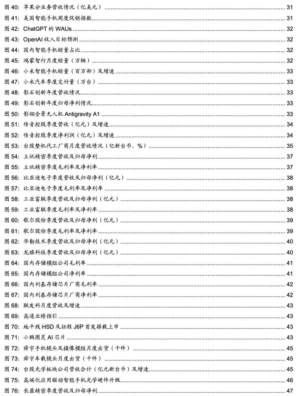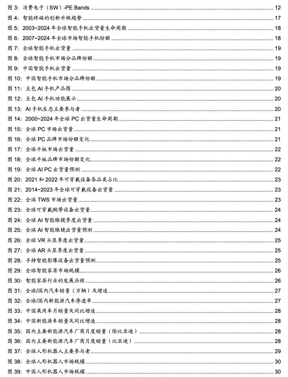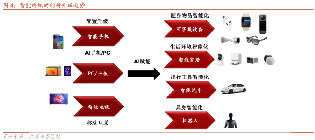 随着AI等技术的渐臻成熟,电子产品的形态逐步发生转变,多个品类的智能终端在随身、生活、出行等场景中创新不断,正在以多点开花的形式遍布在我们生活当中。本章节,我们将对智能手机、PC/平板、穿戴/IoT(耳机、智能手表、智能眼镜、智能影像设备、智能家居)、智能汽车、机器人等终端的景气度与创新进行跟踪。