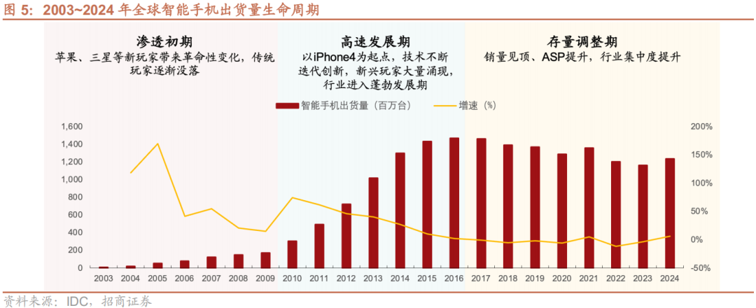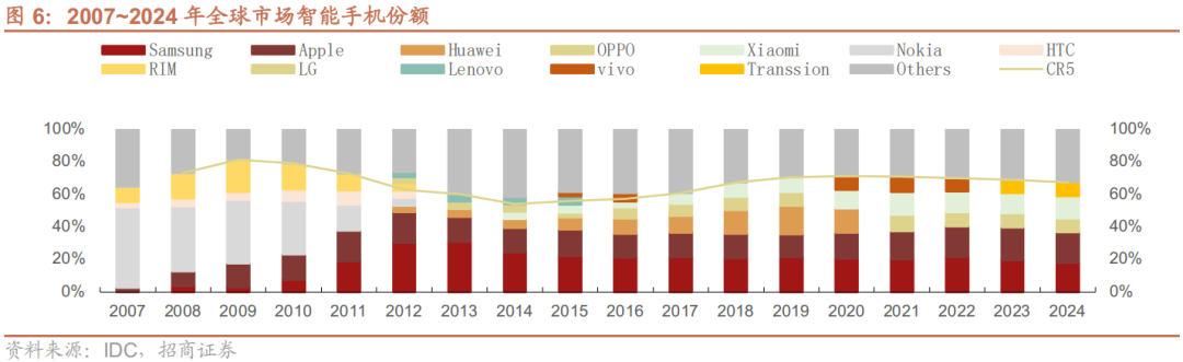 智能手机行业处于存量调整期,2014年后行业集中度提升;2024年出货量经历两年下滑后重回增长。以iPhone4为起点,技术不断迭代创新,智能手机行业进入高速发展期。经过十余年的高速发展,目前智能手机行业处于存量调整期。2014年后行业集中度提升,目前主要玩家包括苹果、三星、小米、OPPO、vivo、华为、荣耀、传音等。据IDC,2024年全球智能手机出货量同比 6.4%至12.4亿部,Top5品牌分别为苹果、三星、小米、传音和OPPO,份额分别为18.7%、18.0%、13.6%、8.6%和8.5%。
