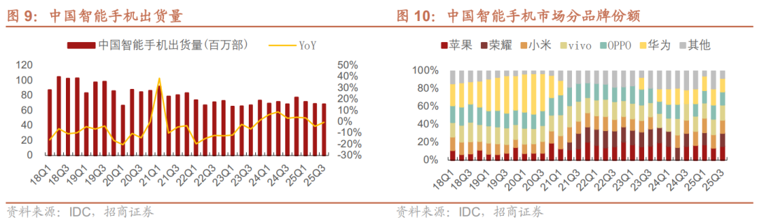 25Q3全球智能手机出货量同比 2.6%,国内市场延续下滑。据IDC,全球市场25Q3智能手机出货量3.227亿部,同比 2.6%,主要系高端市场的带动下,智能手机市场延续复苏态势,创新的外观设计与更具性价比的AI智能手机吸引消费者升级设备,成为市场增长的关键动力。国内市场25Q3智能手机出货量6846万台,同比-0.5%,延续下降趋势,主要系部分需求已于上半年释放,Q3新品发布数量较少,且国补政策收紧的情况下,消费者需求更趋于理性。