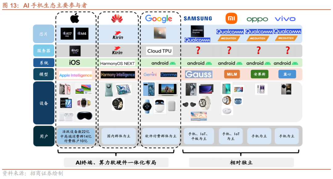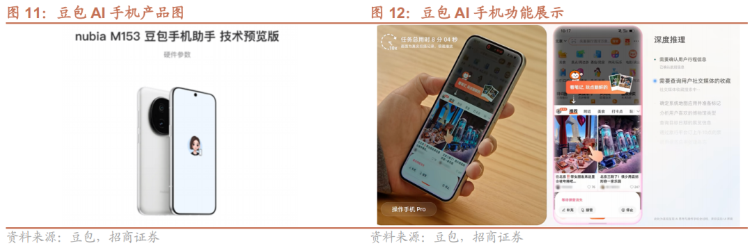 创新方面,AI应用成为手机创新的下一个突破口,近期豆包AI手机正式发售,明年上半年苹果更智能的Siri系统值得重视,安卓也会百花齐放。AI与手机融合的想象空间广阔,或成为手机创新的下一个突破口。1)苹果:苹果Apple Inteligence 24M6重磅发布,10月苹果最新业绩会表示个性化Siri功能进展顺利,将于明年推出,正在大幅增加AI及产品路线图投资。2)谷歌:2025年11月发布Gemini 3.0,在推理能力、多模态输入、编程级交互体验等多领域获高度评价。谷歌将先进的AI模型和传感器技术集成到多样化的设备中,例如25年8月谷歌已发布以AI为核心的手机、折叠屏、智能手表、耳机,此外谷歌还有家庭与智能家居AI硬件、笔记本、眼镜等多样化终端硬件布局,实现从云到端的全方位智能体验。3)华为:2024年发布Harmony Intelligence鸿蒙原生智能,将AI与OS深度融合;2025年11月公布华为鸿蒙 HarmonyOS 6 正式版升级计划,系统级AI能力进一步提升。4)豆包:2025年12月1日,豆包手机助手以技术预览版正式亮相,搭载该功能的努比亚M153工程样机同步开售,售价3499元。该机将豆包大模型融入原生交互体系,可让AI直接控制系统、跨App执行任务、与硬件按键深度联动。同时,豆包手机助手团队表示在和多家手机厂商推进手机助手的合作落地。我们认为,豆包仅仅是系统层面的简单授权,就能通过模拟屏幕点击来联网实现浅层Agent功能。而更深度的来自于AIOS和各APP底层功能融合,另外端侧模型本地快速离线处理、用户数据隐私都是未来关注点,明年上半年苹果更智能的Siri系统值得重视,安卓也会百花齐放。
