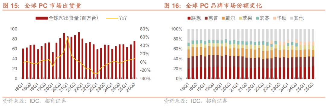 25Q3全球PC出货量同比 9.4%,现有装机量稳步更新。根据IDC,25Q3全球PC出货量同比增长9.4%,总量达7580万台,符合市场预期,表明在Windows 11升级与老旧设备换新潮的推动下,PC市场正保持稳健活力。细分区域差异显著,其中亚太地区(含日本与中国)在本季度表现突出,实现两位数增长;北美市场仍受进口关税政策与宏观经济不确定性的影响。