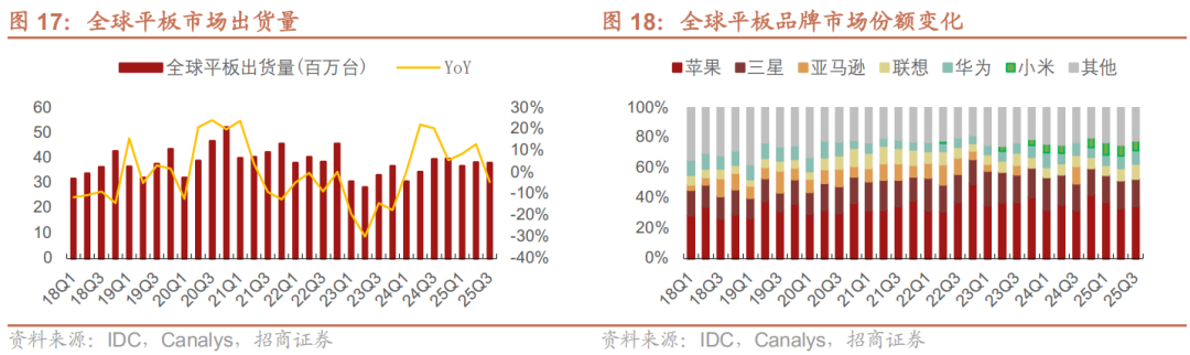 2)PC/平板:Win11换机驱动需求增长,26年关注AI PC及存储涨价对需求影响。25全年PC出货延续增长,更多是来自Win11更新换机推动,预计Window系统更新驱动因素将延续至26年,同时关注存储涨价对需求端的影响。创新方面,AI PC是针对办公等特定场景的AI Agent载体,目前AI PC渗透率有所提升,但并非换机的核心因素,伴随硬件准备就绪和独立软件开发商越发提供本地AI功能,我们判断明年AI PC新品值得期待,预计AI换机驱动因素将在26-28年更为显著。