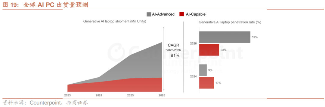 展望未来,2025年Win11换机驱动需求增长且有望延续至2026年,同时关注AI PC及存储涨价对2026年需求影响。IDC认为尽管对支持Windows 11的新型PC的需求依然存在,但这种需求可能会持续到2026年,同时我们建议关注存储涨价对需求端的影响。AI PC方面,Counterpoint 根据计算性能、相应应用场景和计算效率的不同,将AI笔记本电脑分为三类:AI基础型笔记本电脑、AI高级型笔记本电脑和AI功能型笔记本电脑。Counterpoint认为,目前市面上的AI 基础型笔记本电脑可以执行基本的生成式AI任务,并配备了专用的生成式AI 硬件和NPU,用于入门级AI应用。而这些笔记本电脑可以被更高级的AI和AI功能型笔记本电脑所取代,后者拥有足够的TOPS,并由NPU或GPU驱动,能够出色地执行高级生成式 AI 任务。Counterpoint预计AI PC渗透率将在2026年加速增长,主要系硬件准备就绪:下一代Windows笔记本电脑(以及苹果的M系列系统)配备了专为持续的设备上推理而设计的NPU,在越来越多的型号中满足或超过Copilot 的要求;软件拉动:独立软件开发商越来越多地提供本地人工智能功能(创作、协作、辅助工具),从而降低延迟并提高数据隐私;更新催化剂:Windows 10将于2025年10月14日停止支持,这将导致企业升级周期持续多个季度,直至2026年。