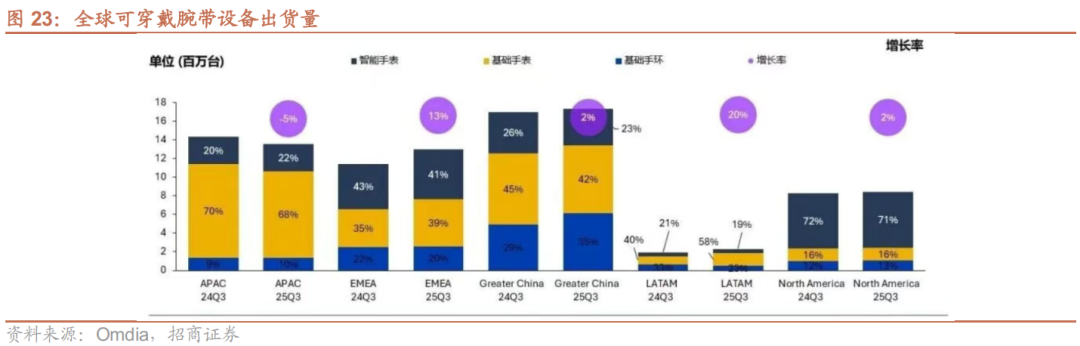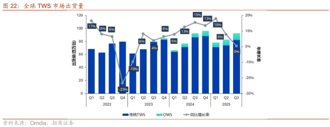 智能耳机、智能手表:a)耳机方面,25Q3全球TWS耳机出货同比微增,OWS出货同比增长显著突破1000万台。据Omdia,2025年第三季度,全球TWS出货量达到9260万台,同比微增0.33%。尽管整体增长有限,但开放式耳机(OWS,一种非入耳TWS设备)出货量突破1000万台,同比增长69%,弥补了传统TWS出货量下降4%的影响,传统TWS出货总量为8200万台。苹果依然保持全球领先地位,凭借其生态系统优势和高端定位占据了约一半的TWS市场价值。最新一代 AirPods Pro 3通过集成心率监测增强健康追踪,显示出在高端市场中生态系统粘性的重要性超越了单纯出货量。同时,小米位居第二,在拉美及其他新兴市场实现三位数增长,通过加速推出50美元以下产品线的功能创新,推动销量增长。b)腕带设备方面,25Q3全球可穿戴腕带设备出货量增长3%。据Omdia,2025年第三季度,可穿戴腕带设备市场小幅增长3%,出货量达到5460万台。尽管出货量增速有限,但市场价值却同比大涨12%,达到123亿美元,反映出消费者正加速转向更高端的可穿戴设备。ASP同比上涨9%,达到225美元,主要受到市场头部厂商的推动。前五大厂商小米、苹果、华为、三星和佳明合计占据了市场总价值的84%及出货量的63%。这种价值主导地位,加上其雄厚的资金和研发资源,使得中小厂商在价格竞争和用户获取方面面临越来越大的压力。