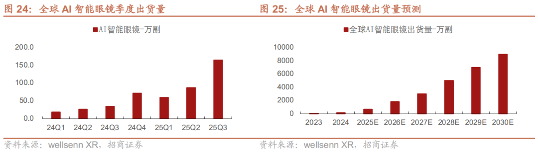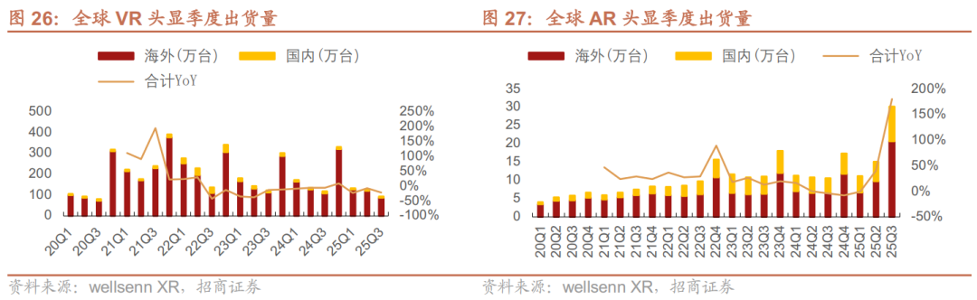 智能眼镜:a)AI智能眼镜:据wellsenn XR,2025年Q3全球AI智能眼镜销量165万台,同比增长达370%,Q3 销量增长主要来自于Ray Ban Meta智能眼镜的增长,销量112万台,第三季度小米、Rokid、雷鸟、等AI眼镜也贡献一定增量,全志V821方案等低价AI拍摄眼镜开始出货销售,贡献了15万台销量。上调2025年AI智能眼镜销量700万台预测,预计全年Meta 实现500万、小米20万销量,华强北白牌AI眼镜预计全年能达到30万-50万台销量,根据Meta在2025年给供应链下单1200万台的信息,以及音频眼镜逐步上线AI大模型,全年AI智能眼镜有望超700万更高预期的可能。b)VR:据wellsenn XR,2025年Q3全球VR销量为93万台,同比下降21%。以Quset 3/3S为主的VR出现销量乏力现象,产品力以及内容没有大的升级,存量用户更新意愿不强,缺乏新内容和用户,Meta 在VR的营销投入被AI眼镜分流,产品销量在持续下降,其他品牌VR/MR情况类似。预计2025年全年销量降至500万台,四季度没有重量级新品上市发售,仅靠Quest3/3S,Pico 4 ultra,PS VR2等产品支撑,预计到2026年Q3整体销量持续呈现出萎缩状态,VR/MR整体态势不佳。c)AR:2025年Q3全球AR销量为30.2万台,与去年同比增长180%,三季度AR眼镜销量大幅增长,主要原因来自几点:BB观影眼镜成本持续下探、场景逐渐深耕,越来越多的企业发布和销售类型的眼镜,企业融资到位,市场推广投放预算增加;光波导AR眼镜受益于AI眼镜的热度销量逐步走高;智能眼镜受关注度高头部企业融资到位,产品研发和销售投放重回正常轨道。将2025年全球AR销量预期提高至95万台,与去年同比增长90%,BB眼镜重回今年销量创新高,AR眼镜受益于AI眼镜的热度销量持续增长,Rokid、影目、阿里夸克、Meta等AR AI眼镜新产品持续发布和上市,为全年高增长贡献新增量,运动类AR眼镜今年预计也会有超预期的销量贡献。