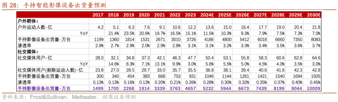 智能影像设备:手持影像设备是快速发展的新兴赛道,除了传统的运动相机、全景相机产品线,穿戴相机、手持云台等新形态设备也开始兴起,我们判断随着运动人数增多及社媒视频分享的普及,远期市场有望达大几百到上千亿市场,较现在空间翻倍。航拍无人机主要用于航拍、跟拍等消费级场景,据ValuatesReport,23年市场规模71亿美元,预计30年增至122亿美元,CAGR为11.4%。
