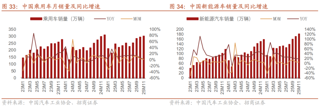 汽车:25H2销量总体维持两位数同比稳健增长,预计购置税补贴退坡将致26年销量增速下行。25H1国内汽车市场销量同比 13.8%;下半年车市经历7-8月传统淡季调整后,九十月份稳健增长。根据中汽协,25年7/8/9/10/11国内乘用车销量同比 14.7%/16.5%/13.2%/7.5%/1.2%。新能源车方面,新能源汽车全额免征购置税政策将于2025年12月31日截止,2026年1月1日起购置税将变为减半征收。我们预计受25年以旧换新带来的高基数、26年购置税补贴退坡影响,26年国内汽车销量增速将出现下行。