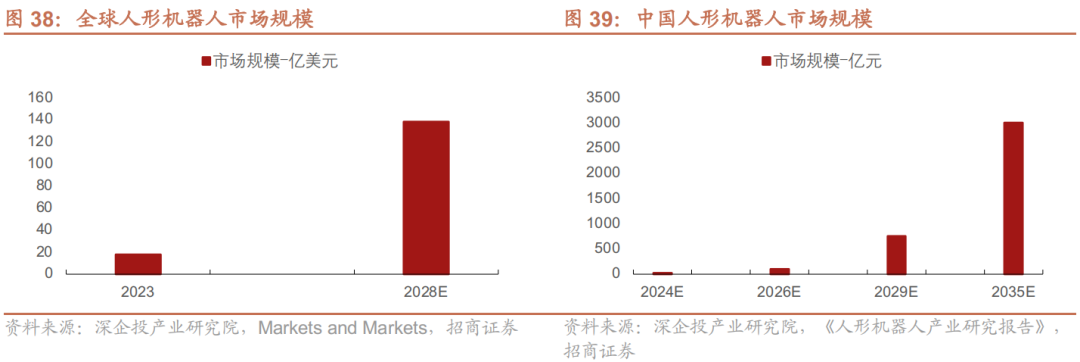 2030年全球人形机器人市场规模有望达数百亿美元。根据2023年7月Markets and Markets报告,全球人形机器人市场规模预计将由2023年的18亿美元提升至2028年的138亿美元,年复合增速约50.2%。根据2024年4月首届中国人形机器人产业大会上发布的《人形机器人产业研究报告》预测,2024年中国人形机器人市场规模将达约27.6亿元,2026年达到104.71亿元,2029年达到750亿元,将占世界总量的32.7%,比例位居世界第一,到2035年有望达到3000 亿元规模。根据特斯拉官方微信公众号2022年10月1日发布的文章,特斯拉机器人预计将在3-5年内交付,产量将达到数百万台,价格可能不到2万美元,对应市场规模可达数百亿美元。