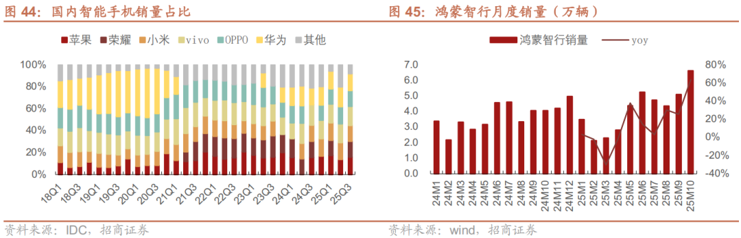 (4)华为:11月底Mate80系列正式发布,9月尚界正式上市,下半年鸿蒙智行交付量持续走强。手机:11月28日发布华为Mate 80系列,首发搭载HarmonyOS 6.0操作系统,采用麒麟9020、麒麟9030和麒麟9030 Pro芯片,外观采用双环设计,Pro Max和RS非凡大师搭载双层OLED屏幕、配备双潜望长焦,售价4699元起,开售以来市场反馈较佳。汽车:8月以来鸿蒙智行销量持续增长,伴随9月23日尚界H5正式上市,鸿蒙智行在售车型增至5个子品牌,覆盖了从十几万元到百万元级别的广泛市场区间,进一步支撑了交付规模的扩大。25M11鸿蒙智行全系交付81864辆,当月交付再创历史新高。智能驾驶方面,公司预估高速L3规模商用或在2026年实现,而城区L4的商用将会在2027年实现,并且2027年L3级自动驾驶将迎来规模放量。11月20日华为举办2025华为乾崑生态大会,截至目前,华为乾崑智驾已合作33款量产车型,累计搭载量突破100万辆,城区领航辅助市场占有率国内领先。
