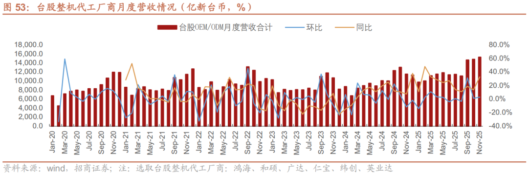中国台湾代表厂商月度数据跟踪:从台股6家头部整机厂月度数据来看, 25Q3合计收入37418亿新台币同比 15%环比 7%,25M11月合计营收15348亿新台币同比 33%环比 3%,对于AI需求展望乐观且明确,客户需求持续旺盛,并加速北美地区的AI服务器产线的布局。从最新数据来看,1)鸿海:25Q3收入20574亿新台币同比 11%环比 14%,M11收入8443亿新台币同比 26%环比-6%,同比增长源于AI云端网络产品及元件类产品拉货动能强劲,消费智能产品受汇率影响同比下滑,电脑终端产品表现同比持平。公司认为25Q4 AI机柜出货持续放量,ICT产品进入下半年旺季,预计Q4有望实现同环比增长,但需要密切关注全球政经局势和汇率变化的影响。2)广达:25Q3收入4953亿新台币同比 17%环比-2%,M11收入1930亿新台币同比 37%环比 11%,公司表示目前积压的AI服务器订单已经排到2027年,因客户需求强劲,公司会继续扩产,预计2026年底公司AI服务器产能将实现翻倍增长,目前公司服务器营收占比70%,其中AI服务器占比70%,25年AI服务器收入已翻倍增长,预计26年该领域收入将再翻倍;3)纬创:25Q3收入5678亿新台币同比 108%环比 3%,M11营收2806亿新台币同比 195%环比 52%,公司表示25Q4 AI需求强劲,预计26Q1经营表现环比相当,预计26年全年可实现逐季增长;目前公司服务器业务占比超70%,其中AI服务器占95%,公司25年在交换机业务已实现突破,预计26年迎来放量。4)和硕:25Q3收入2579亿新台币同比-12%环比-4%,M11收入1018亿新台币同比-4%环比-14%,公司加速北美地区产能的扩张,目前墨西哥工厂25H2已投入量产(可生产从L1(零件制造)到L11(服务器整机系统)的制程的产品),美国德州工厂(负责L6(主机板组装)到L11)预计26Q1投产,届时将生成GB300或B300 AI服务器以满足北美市场的需求;5)仁宝:25Q3收入1871亿新台币同比-23%环比 4%,M11收入630亿新台币同比-21%环比 2%,服务器业务方面,仁宝已逐步从传统企业客户拓展至CSP客户,并持续深化与AMD的合作,AI服务器出货占比稳健提升;6)英业达:25Q3收入1763亿新台币同比 8%环比-6%,M11营收522亿新台币同比-14%环比-5%,预计Q4 NB出货与25Q1相当,全年NB出货望增长3-5%,AI服务器全年有望增长40%以上,业务占比提升至40-50%,其中H1出货主力为服务器机柜,H2出货以L6(主机板产品)为主,预计26年业务占比提升至50%以上。