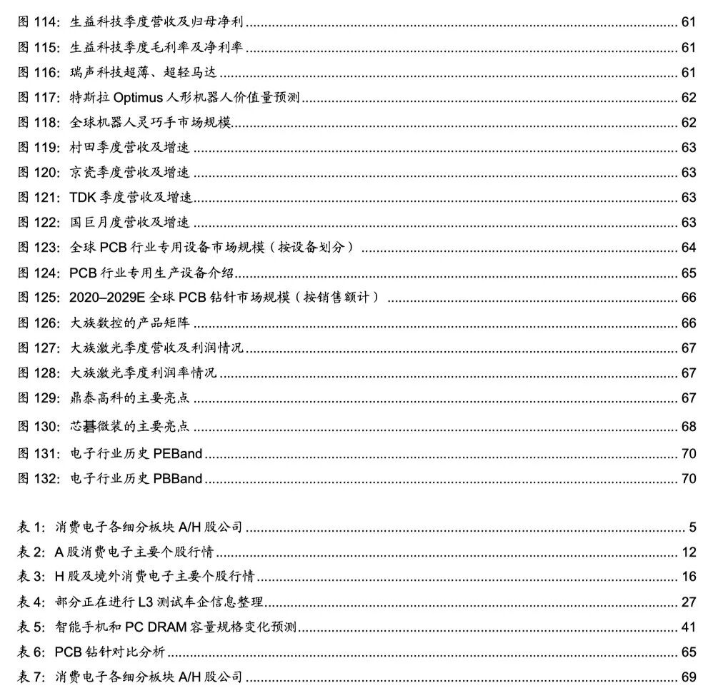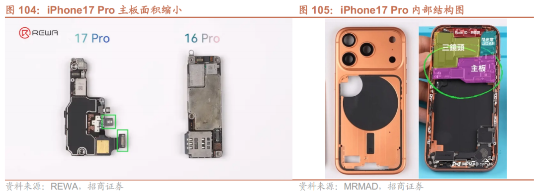 消费电子领域,苹果明年硬件AI化升级创新以及折叠屏手机望推动软硬板量价齐升。硬板方面,考虑到iPhone的AI化趋势带来的续航需求,且未来苹果亦有进一步轻薄化的趋势,钢壳电池在机内的空间占比会不可避免提升,挤占机内其他模组及主板的空间,我们认为iPhone主板未来的集成度将持续提升,主材、线路设计均有创新升级的需求。而根据REWA的拆解数据,iPhone17 Pro的主板采用传统双层叠板结构,布局更为紧凑,从原本右侧改为机身上方区块以横向排列,尺寸较16 Pro进一步缩小,集成度再一次提升。展望26-27年新机,我们预计一方面主板所用材料以及加工工艺均会继续升级,此外机内芯片的封装工艺亦可能有所变化从而带动主板的面积和线路设计亦有革新。软板方面,一方面受制于机内物理空间的压缩,软板层数将朝着更高层发展,从目前的2-3层向4-6层发展;另一方面,AI iPhone的功能模块越来越多,光学、声学、显示、马达等模组也在升级,数据传输要求提高,这些均会推动明年iPhone新机软板的升级迭代,再考虑到26年底或27年初有望发售的折叠屏iPhone,FPC的价值量有望得到较大提升。同时,高阶HDI/SLP在安卓旗舰的渗透率望逐步提升。从今年下半年安卓旗舰新机的发售来看,安卓高端机AI化功能越来越多,价格呈现逐步提升趋势,安卓高端机硬板有望逐步采用更高阶的HDI或SLP工艺。