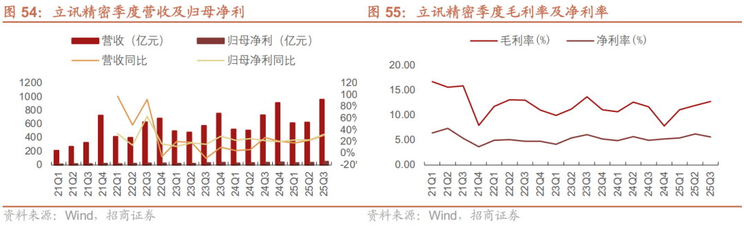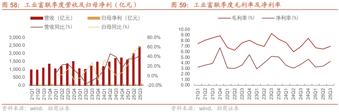 3、工业富联:AI服务器及高速交换机等AI业务持续放量增长,产品结构持续优化。25Q3实现收入2432亿元同增43%环增21%,归母净利104亿元同增62%环增51%,扣非归母净利100亿同增61%环增 48%;毛利率7%同比持平环比 0.5pct,净利率4.3%同比 0.5pct环比 0.8pct。1)云计算业务:AI服务器成长显著,产品需求持续提升。2025年前三季度,公司云计算业务营业收入较上年同期增长超过65%,第三季度单季同比增长超过75%,主要受益于超大规模数据中心用AI机柜产品的规模交付及AI算力需求的持续旺盛。特别是云服务商业务表现亮眼,前三季度营业收入占比达云计算业务的70%,同比增长超过150%,第三季度单季同比增长逾2.1倍。其中,云服务商GPU AI服务器前三季度营业收入同比增长超过300%,第三季度单季环比增长逾90%、同比增长逾5倍。通用服务器出货亦保持稳健,整体云计算业务营收结构持续优化。2)通信及移动网络设备业务:AI提振需求表现,相关业务成长强劲。2025年前三季度,公司通信及移动网络设备业务表现稳健。其中,精密结构件业务受AI智能终端新品推出带动,客户换机需求上升,带动业务持续增长。另外,在交换机方面,因AI需求持续放量,交换机业务成长显著,三季度单季同比增长100%,其中800G交换机三季度单季同比增长超27倍。